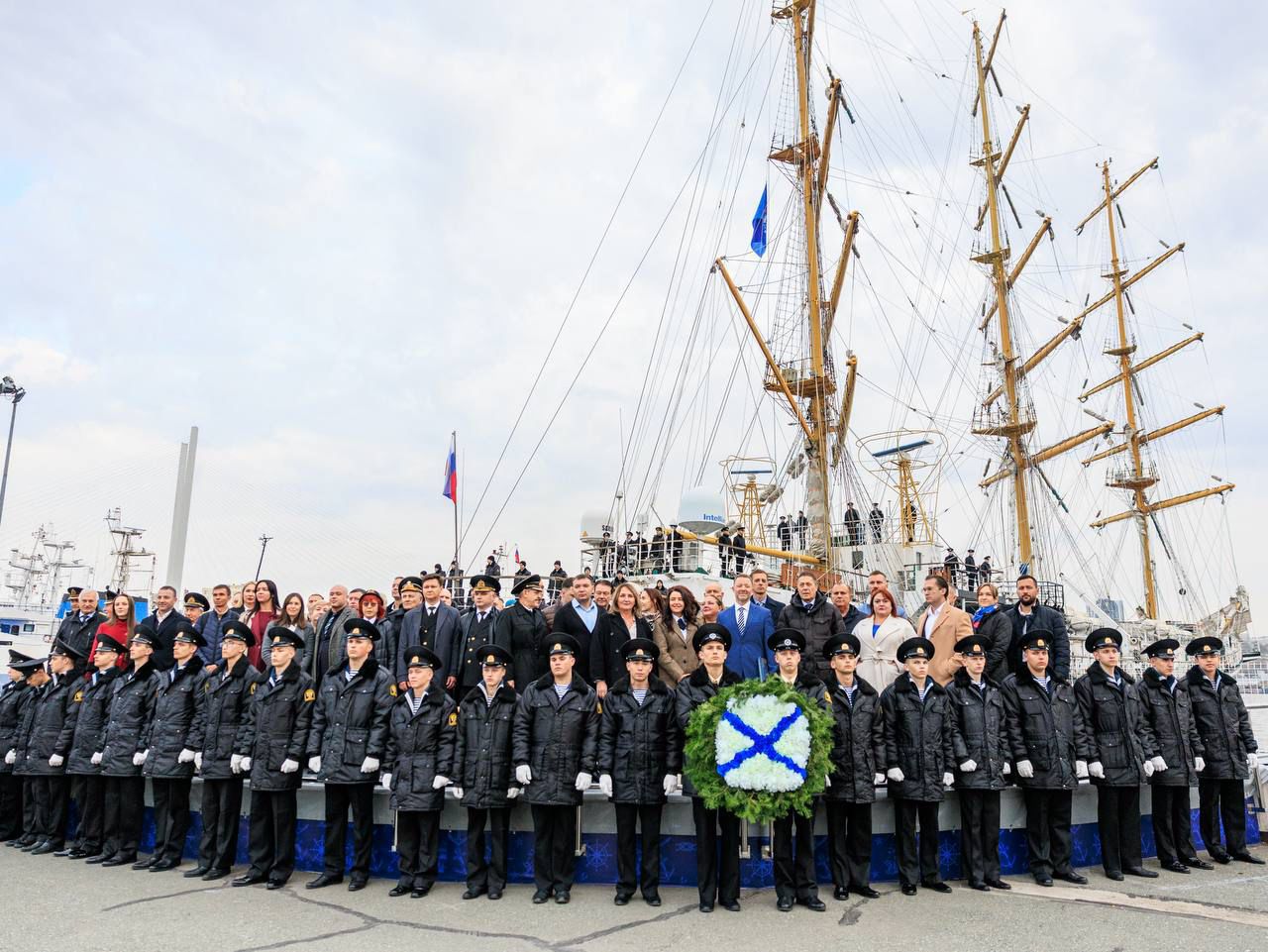 Перед церемонией открытия доски участники мероприятия почтили память моряков, погибших 120 лет назад в Цусимском сражении во время Русско-японской войны, возложив гирлянды и цветы к памятному знаку. Это событие стало одним из самых трагических, но одновременно и самых героических эпизодов в военной истории России.
