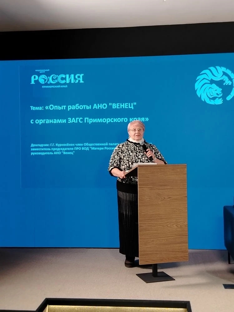 Курносенок Галина Георгиевна выступила с докладом на тему «Об опыте работы АНО "ВЕНЕЦ" с органами ЗАГС Приморского края», в котором рассказала о достигнутых результатах и обозначила перспективы совместной работы в современных условиях. В своём выступлении она подчеркнула значимость объединения усилий государственных и общественных структур для укрепления института семьи и развития социальных инициатив.